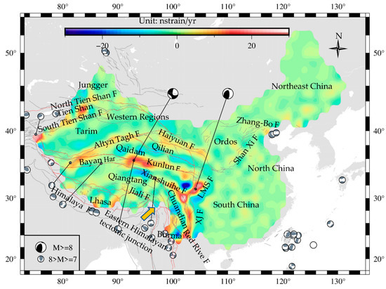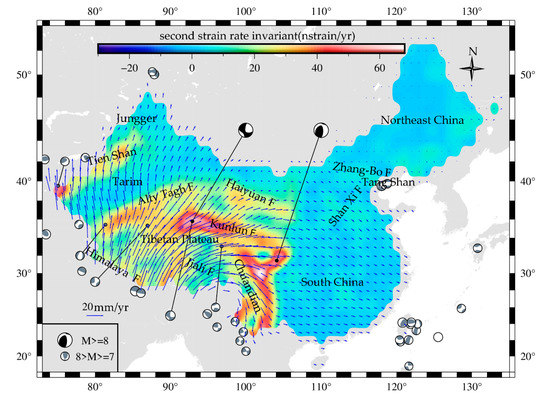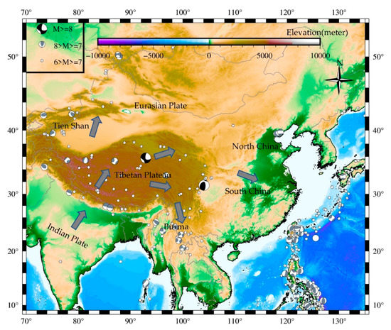 Located in the southeast of the Eurasian plate, sandwiched between the Indo-Pacific plate and the Philippine Sea plate, China is an area of strong late quaternary and modern tectonic activity. Under the interaction of the Indian Ocean plate, the Pacific Plate, the Eurasian Plate, and the Pacific Plate, as well as the action of the deep earth dynamics within the Eurasian plate, continental China has a unique spatial distribution pattern of strong earthquakes. China is a region with the strongest earthquakes in the global continent (Figure 1), and 33% of the earthquakes in the global continent occur in continental China [1]. Urban earthquake disaster is particularly prominent, which brings a great threat to people’s lives and the development of civilization. Therefore, understanding the laws of block movement and crustal deformation plays a great role in the study and prediction of earthquakes, and at the same time, it can reduce the adverse effects of earthquake disasters to a certain extent [2].