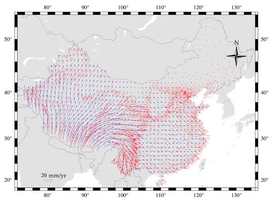 In the process of interpolation data processing, a mask of the research area was first established, and the processed horizontal velocity field data were interpolated within the mask by 1° × 1°. Poisson’s ratio 0.5, which represents typical elasticity, was selected. After interpolation, two continuous scalar fields are obtained, namely, the velocity component in the east direction and the velocity component in the north direction in the study area.