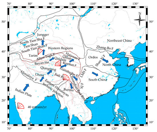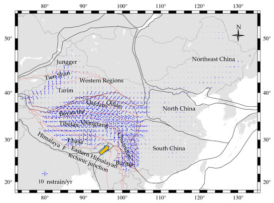 The collision between the Indian Plate and the Eurasian Plate caused a large-scale crustal deformation and crustal motion of continental China (Figure 1). Researchers have studied the characteristics of tectonic movement in continental China, such as crustal shear deformation, crustal expansion and subtraction, crustal rotation deformation, and fault movement [3,4,5,6,7]. Furthermore, many scholars have evaluated the tectonic activity and seismic activity of continental China [8,9,10,11,12,13,14,15]. Nowadays, there are two models of crustal deformation, “block model” [12,13] and “continuous model” [14,15]. The block model is mainly proposed by geologists, who believe that most of the deformation occurs along the main block boundary fracture. On the other hand, the continuous model is mainly proposed by geophysicists, who believe that the deformation is quasi-continuous, subject to the solid flow of viscous material similar to fluid control.
