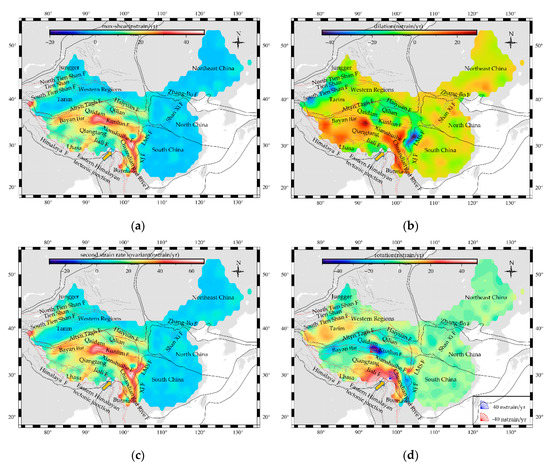 We referred to the method of calculating the strain rate published by Hackl [42] that it can be calculated the velocity gradient by using the spatial partial derivative of the interpolation velocity field, and we obtained the strain rate component. Afterward, the derivatives along the local north direction and east direction can be calculated to generate four continuous fields, which can represent a continuous strain rate tensor in a linear combination. Assuming that there was a small deformation, in the case that GMT can be automatically converted into geographical coordinates for calculation, the component of the strain rate tensor was calculated as shown in Equation (1) [42]: