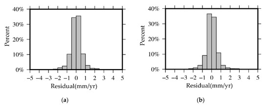 At first, the residuals of direct verification and cross-verification were counted, and the results are shown in Figure 5. For the residue results directly verified, more than 90% of the residuals are less than 1 mm/yr and are normally distributed. For the cross-validation residual results, more than 75% of the residuals are less than 1 mm/yr, and all residuals are less than 2 mm/yr. However, due to the small amount of data, they cannot be normally distributed. Overall, the residual results show that our model is reliable.