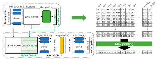 PointNet [33] was the first neural network architecture to directly receive point cloud data as input for learning. It directly uses point cloud data without converting the data into 3D voxels or 2D images at a specific time; this prevents the loss of original information and reduces unnecessary processing time. PointNet uses symmetric functions that output the same results regardless of the input order (i.e., addition and multiplication). As shown in Figure 1, the information for each point is output independently as the values of multiple channels using a multilayer perceptron (MLP), while the max-pooling layer, which is a symmetric function, extracts the largest value for each channel of all output point features independent of the order of the points to accumulate the global features from all input points. Therefore, PointNet can directly label input points by taking into consideration the features of each point and the features of the global shape of the input points.