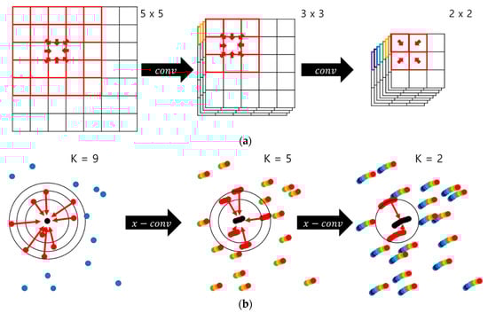 PointCNN [35] is designed to learn the local correlation between points in space by generalizing the structure of a convolution neural network (CNN). PointCNN uses untransformed point cloud data in the same way that PointNet does, and it can learn regardless of the input order by generalizing the principle of grid CNNs applied to images and learn the correlation between adjacent points in space. For an image, a CNN generally reduces the input range for each convolution (conv) layer and increases the channels to recursively learn the correlation between evenly arranged data points and their surroundings (Figure 2a). PointCNN also reduces the number of input neighboring points for each layer and increases the channels to recursively learn the correlation with the surrounding points (Figure 2b) but instead uses x-conv, which inputs neighboring points using K-nearest neighbor (KNN), rather than general conv layers to input point cloud data with an irregular format.