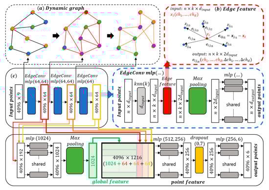 Figure 3. The (a) dynamic graph, (b) edge features, and (c) semantic segmentation network of Dynamic Graph Convolutional Neural Network (DGCNN).