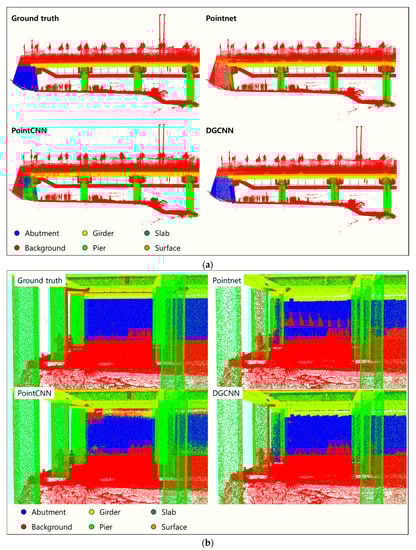 The qualitative results of the three classification models are presented in Figure 7. The color of each point represents the classified component (abutment, background, deck, girder, pier, slab, and surface). PointNet did not accurately classify the piers, abutments, and background located on the same z-axis, whereas the girders were distinguished based on specific z values. PointNet also could not classify the abutments and the columns (Figure 7a). The PointNet network, which learns only the independent features for each point and the global features using symmetric functions on the input points, did not learn the relationship with the surrounding points. In contrast, PointCNN learns the relationship with the adjacent points in the xyz coordinate system and thus accurately classified the background and the girders (i.e., the horizontal components) as well as the piers and abutments (i.e., the vertical components). However, it did not accurately classify the piers and abutments that did not have large differences in the local features (Figure 7a). DGCNN accurately classified the components that were separated from each other such as the piers and abutments because it learned the relationships with points adjacent to each other in xyz space and that were similar based on its self-updated features. However, as shown in Figure 7b, because various self-updated features were used, the edges between the piers and the background were relatively less accurate than with PointCNN.