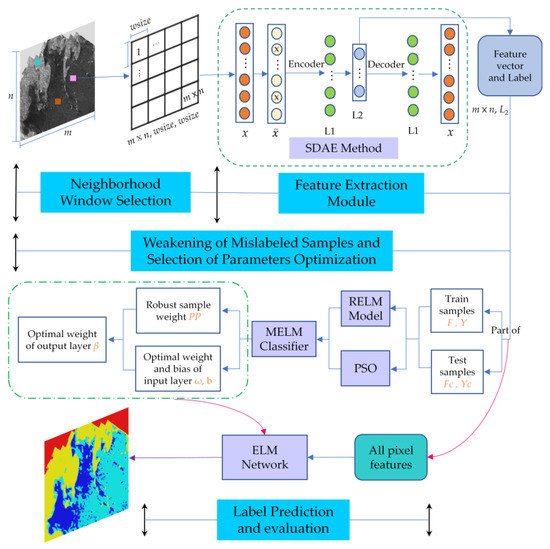 Firstly, the size of the neighborhood window is set; then the neighborhood sub-image of each pixel is obtained via sliding window sampling. Secondly, an unsupervised SDAE approach is applied to extract the deep-seated feature information from their sub-images. The feature information and labels corresponding to the training and testing samples are then selected and sent to the MELM classifier. The interference effect of the mislabeled samples on the network is weakened by weighted estimation and the Parzen window, and optimal input parameters of the network are selected by PSO. Finally, the feature vector and label information of the testing samples are input into the training network to obtain the category of prediction labels. Many objective metrics are applied to quantitatively evaluate the sub module of the classification method. Moreover, the feature information extracted from all pixels is input into the ELM network to obtain the sediment prediction map of the entire area, while the performance of the proposed method is analyzed from the perspective of a subjective visual effect.