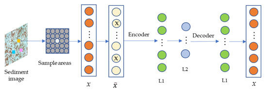 In general, numerous researchers have studied the aspects of feature extraction and classifier design. Feature extraction involves extracting objective indicators or in-depth hidden information from the backscatter image; these extracted indicators and information are then accurately applied to characterize the sediment type and properties. Commonly used feature indexes include: basic probability distribution parameters [7], the terrain slope [8], the gray-level co-occurrence matrix (GLCM) [9], the power spectrum characteristics [10], the angular response curves [11], the Gabor texture and the seabed roughness [12]. However, these feature indexes are easily disturbed by residual errors in the original data. In addition, deep learning, having strong learning ability, has attracted considerable interest in the terms of feature extraction. Among the deep learning approaches, a convolutional neural network (CNN) was adopted in a previous paper to extract sample features from large-scale side scan sonar images [13]. However, it was difficult to capture the long-distance features because of the perceptual field of view. On the other hand, a stacked auto encoder (SAE) [14] was applied in another paper to extract the hidden features from hyperspectral images using an unsupervised approach, but the risk of overfitting with the SAE was affected by the model complexity, the number of training samples, and data noise. Therefore, a stacked denoising auto encoder (SDAE) was used to enhance the robustness and generalization ability of the SAE model. At present, the SDAE model is widely used in data reduction and feature extraction, especially for extracting robust features from remote sensing images [15,16,17]. Similarly, acoustic backscatter images have the same scattering characteristics as remote images from the synthetic aperture radar, so it is necessary to extract the robust features for subsequent sediment classification.