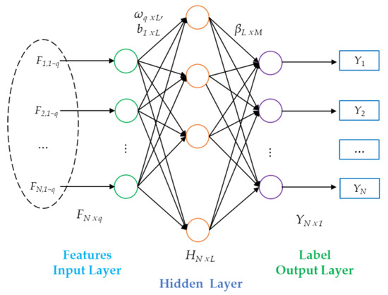 A feature dataset and corresponding labels are selected as the training samples {(Fj, Yj)} ⊂RN × Rq, giving a total of N samples. The input feature dimension is q, and the maximum category number of label Yj is m. Suppose the number of hidden layers is L. The activation function is g(f), and the weight and bias parameters (wi, bi) of input hidden layer are randomly selected (i = 1, …L). Therefore, the relationship between the feature set Fj (j = 1, …, N) and the output label Yj is: