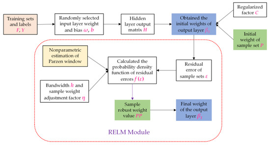 A new weight matrix of the robust estimation PP is acquired, which is introduced into Equation (9) to obtain the final output layer weight β1 of the RELM model, PP = diag{pp1, pp2, …, ppN}. The weight value of the reliable samples is increased, which is beneficial in improving the overall robustness of the network and in accurately classifying the label categories of feature samples.