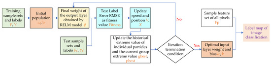 The random selection of the input weights and deviations causes the ELM model to generate overfitting and instability problems [41], requiring a swarm intelligence algorithm to optimize its parameters. Common swarm intelligence algorithms include the ant colony algorithm [42], GA [27], and PSO [28]. In this paper, the PSO and RELM model are combined into the MELM classifier to optimize the weights and biases of the input layer (Figure 5). The fitness values are expressed by the output errors of testing samples.