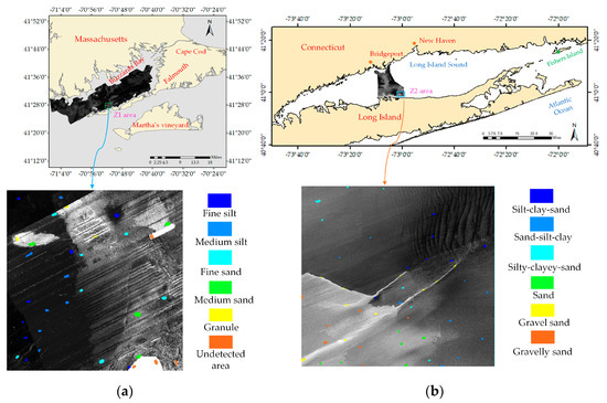 Dataset 2 was the result of a coastal survey conducted by the National Oceanic and Atmospheric Administration (NOAA), Stony Creek University, and Rhode Island University from 2001 to 2013 in the Long Island sea area. Its regional location is shown in Figure 6b. The backscattered data collected during this period were stitched into a 1 × 1 m results map. We selected the area near the coastline and marked it as Z2. The refined classification provides basic data for the study of biological population distribution and sediment types. Referring to the classification results for a large-scale object-oriented image [45], the sedimentary types in the Z2 area were: silt–clay–sand, sand-silt-clay, silty-clayey-sand, sand, gravel sand, and gravelly sand (Figure 6b). The number of training and testing samples are shown in the last two rows of Table 2.