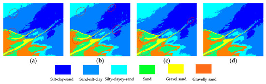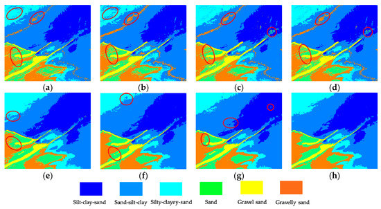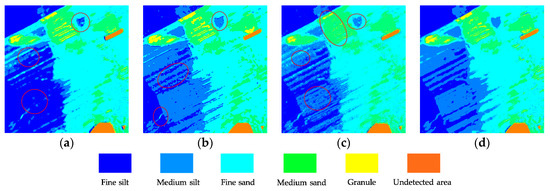 To further compare the feature extraction performance of the four approaches, the sediment prediction maps of the entire area were applied to characterize their overall generalization universality. Figure 7a shows that the Gabor filter easily confuses fine silt and medium silt, causing a large area of misjudgment. Many adjacent sediment types interfere with each other in Figure 8a, such as between gravelly sand and sand-silt-clay. The sediment boundary line treated by the CNN was disturbed in the form of a zigzag (Figure 7b and Figure 8b). Figure 7c and Figure 8c display the classification problem of zigzag or scatter distribution, reflecting that the SAE inevitably brings the residual errors from the original image into the feature vector, thus providing error information for the type judgment of subsequent classifiers. However, Figure 7d and Figure 8d processed by the SDAE show that the classification of sediment is clearly hierarchical and continuous, except for a few scattered points. SDAE introduces the zero masked fraction into the image so that the training network is able to learn how to remove noise automatically. The feature information extracted by the SDAE is more robust, reducing the interference of residual error on the subsequent classification.
