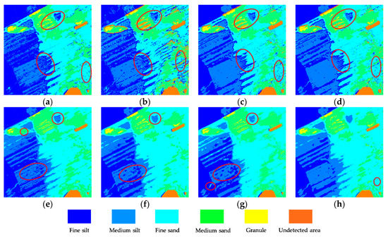 There are many large misjudgment areas and scatter confusion problems in Figure 9a, which indicate that the RF is unable to deal with the interference of residual error on sediment type. Figure 9b–d shows that the two kinds of sediments with similar intensity values make it difficult for the SVM, GA-SVM and PSO-SVM models to weaken their mixed classification interference, such as for granule and undetected area. In addition, Figure 9e shows that the ELM has a problem of inaccurate prediction for the unbalanced sediments of granule. Figure 9f–h shows that the classification interference of fine silt to medium silt can be improved, especially with the proposed MELM model. Better still, the classification quality of the original strip shadow is improved to a great extent, such as in the middle image where the medium silt acts on fine sand. Only in the lower right corner of Figure 9h does a small part of scattered point distribution exist.