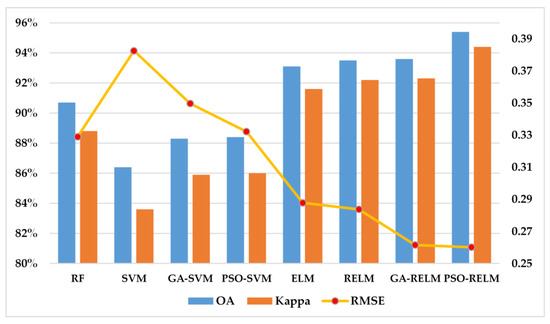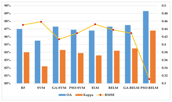 Figure 11 and Figure 12 display the results for the overall evaluation indexes. Since the backscatter image in the Z2 area contains relatively fewer residual errors and noises, the values of the OA, kappa and RMSE are higher in the Z2 area. This also shows that the quality of the original data has greatly improved the accuracy of classification. Compared with the previous four classification methods, the overall metrics of the ELM family model can match the others or achieve higher scores in the Z1 and Z2 areas. In addition, the ablation module of the RELM provides accuracy improvement for the values of OA, kappa and RMSE. In particular, the PSO module in our MELM model undoubtedly achieves the best performance in the process of intelligent optimization, while the RMSE error values for label prediction reach 0.3110 and 0.2601 on the testing samples of Z1 and Z2 areas, respectively. Therefore, the combination of two ablation modules effectively enhances the test accuracy and the stability.