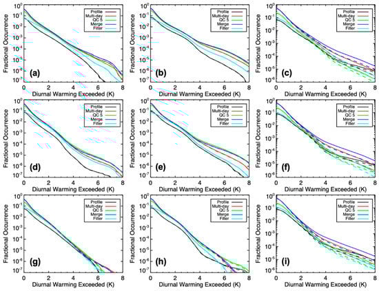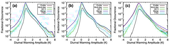 A more consistent reduction in DWamp values across all sensors was obtained by filtering out any derived amplitudes obtained corresponding to wind speeds greater than 3 m/s (termed the “filter” methodology). Warming in excess of 6 K at higher wind speeds is not expected, and the fact that DWamp estimates of that magnitude were obtained under those conditions strongly suggests the presence and influence of noise. For Himawari-8 and GOES-16, DW estimates filtered by wind speed provide the best overall match to the distribution of large-amplitude events from the profile methodology. Filtering by wind also appears to consistently provide a conservative estimate of the frequency of the largest warming events, and the agreement with the profile methodology provides initial support to the assertion that, with appropriate care, the operational SST retrievals can provide viable estimates of extreme DW. The “optimal” choice of a wind speed threshold or other filtering criteria is open to further investigation, but the use of filtering does appear to be a valuable option.