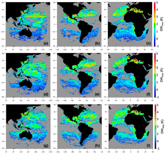 While DW up to 6 K is frequently observed within the satellite scenes, the overall likelihood of the DW at any grid cell exceeding 4 or 6 K is small given the expanse of the oceans. Based on the reference profile methodology, the probability of DW exceeding 4 K ranges from 1.3 × 10