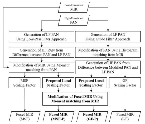The proposed methods are based on the existing MSF [] and GF [] methods. The differences between it and the two mentioned methods are compared and presented according to the progress of the image fusion (see Figure 1). The first difference is the modification of the PAN and MIR images. The MSF method modifies MIR based on PAN images, while in contrast, the GF method modifies the statistical characteristics of PAN images based on MIR images.