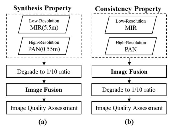 There are other two validation methods, the synthesis property and consistency property, that are mainly used to evaluate the quality of the fused image (see Figure 2) [,]. The synthesis property considers that the fused image should be as close to the reference image as possible. However, at the full scale, the synthesis property can’t measure the differences between them, so the tested images need to be degraded by the scale ratio between the pixel sizes of the PAN and MIR images. By using degraded images, the degraded fused image is compared with the original observed MIR image as a reference. Next, the consistency property shows the degree to which the spatial degraded fused image is identical to the original observed MIR. MTF-filter method [] and spline interpolation were applied for image degradation.
