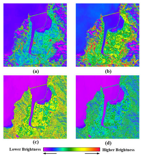 Figure 4 shows the PAN and MIR images before and after modification (See Figure 1). Figure 4a,c are original MIR image and PAN image. Figure 4b,d are the MIR image and the PAN image modified by the corresponding methods. In accordance with each method, high frequency component is injected into the MIR images before and after modification to produce the fused images. In other words, images fused into MSF will have characteristics similar to Figure 4b. Therefore, the statistical characteristics of the fused images will be closer to the PAN images than to the MIR ones.