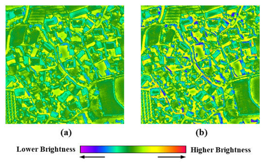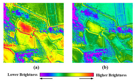 The MSF and GF methods use global scaling factors, with estimated values of 1.16 and −15.88, respectively. On the other hand, the proposed methods use local scaling factors, and the average of the estimated values is 1.02 (MSF-P) and 1.05 (MSF-P), respectively. Compared with other methods, the estimated value in GF method shows a very large difference. This reason is due to the difference in characteristics of the applied satellite sensor. This is because in the previous GF method, the scaling factor was empirically estimated according to the ratio of the range and skewness of the thermal infrared (TIR) and shortwave infrared (SWIR) images of LANDSAT 8 []. Therefore, if the scaling factor proposed in this study is directly applied to KOMPSAT 3A MIR image fusion, both spatial details and thermal information may be lost. Meanwhile, the proposed methods use local scaling factors estimated according to the size of a designated moving window. This is because the difference between the emissivity and reflectance of PAN and MIR may appear differently depending on the characteristics of the ground surface. Accordingly, in the proposed methods, local scaling factors ranging from −0.7 to 2.82 have been estimated (see Table 2). Finally, the proposed methods have the feature of matching the initial fused image with the mean and standard deviation of the MIR image. Figure 6 shows the images before (Figure 6a) and after (Figure 6b) the transformation. Through this process, distorted spectral information in the fused image can be minimized.