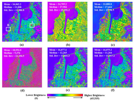 In Figure 7, (a) and (b) represent images of the original MIR and Pan respectively. Figure 7c–f presents fused images produced by both the previous and the proposed methods. The upper left-hand corner of Figure 7 represents the mean, median, and standard deviation for the DN values of each image. The color scale of each image was expressed in the same range from 0 to 65,535. As mentioned earlier, the fused image with MSF method (see Figure 7c) shows spectral characteristics very similar to the modified MIR image (see Figure 7a). The image in Figure 7d is fused into GF method and shows a very large spectral distortion. This is the result of injection of inverted high frequency information due to underestimated scaling factor. Meanwhile, Figure 7e,f show patterns similar to those of low-resolution MIR images (see Figure 7a). However, they also highlight some differences in artificial regions such as buildings, paved roads, and solar panels. The reason for this is probably due to differences in the extraction method of high frequency components. This means that the guide filtering technique may be more effective if the purpose is to improve the resolution of MIR images. Figure 8 is an enlarged image of area A in Figure 7. In Figure 8, (a) and (b) represent images of the original MIR and Pan respectively. And (c–f) of Figure 8 represent images fused by MSF, GF, MSF_P and GF-P methods respectively.