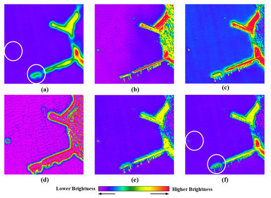 Figure 9 is an enlarged representation of Figure 8 in Area B. Area B has a dock adjacent to the sea. The differences in each fusion methods are similar to Figure 8. In other words, it can be judged that the fused image by the proposed GF-P method (Figure 8f) are most appropriately satisfied with the improvement of spatial resolution and the preservation of spectral characteristics. The white circle in Figure 9a indicates the area where a ship is at anchor or in operation. Note that in Figure 9, the size of the ship is very small, so it is impossible to determine whether the ship is operating or not solely by the temperature of the ship. However, if the size of the ship is larger than the resolution of the MIR image, it will be possible to effectively determine through the fusion image the presence or absence of the ship and whether it is running or not.