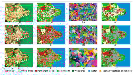 RGB image, pixel-based (PB) classification, spatial cluster (SC) identified by Simple Non-Iterative Clustering (SNIC), and object-oriented (OO) classifications of a portion of the study-area. (a) RGB image, (b) PB, (c) SC, (d) OO for Landsat 8; (e) RGB image, (f) PB, (g) SC, (h) OO for Sentinel 2; (i) RGB image, (j) PB, (k) SC, (l) OO for PlanetScope.