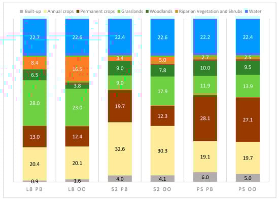 Percentages of the total area occupied by the LULC classes in the selected classifications (L8: Landsat 8, S2: Sentinel 2; PS: PlanetScope; PB: pixel-based; OO: object-oriented).