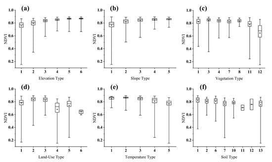 Statistic of the main influencing factors of NDVI: (a) elevation, (b) slope, (c) vegetation type, (d) land-use type, (e) temperature, (f) soil type.