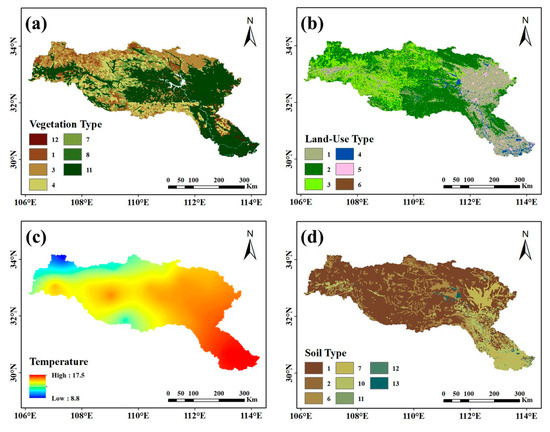 The soil type, vegetation type, and land-use data were obtained from the Resources and Environment Data Cloud Platform of the Chinese Academy of Sciences [42], and they were resampled to a 1 km resolution. The classification standards for the soil type, vegetation type, and land-use type were referenced from the 1:1,000,000 Soil Map of the People’s Republic of China, 1:1,000,000 China Vegetation Atlas, and Multiperiod China Land Use and Land Cover Change Remote Sensing Monitoring Data Set (CNLUCC) [48], respectively.