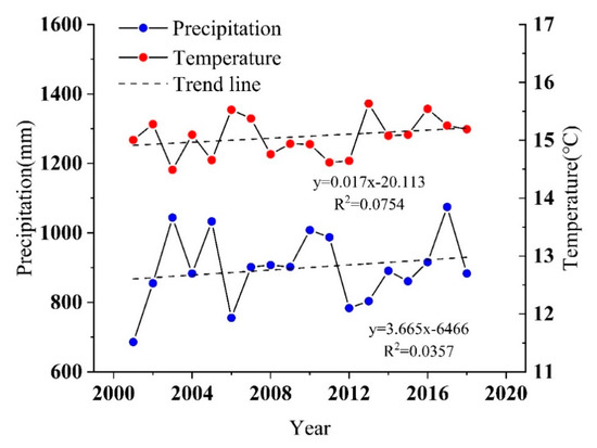 where n is the number of years (in this study, n = 18), Ci is the annual meteorological data for each pixel point in year i, and Tslope is the slope of the linear regression equation of the interannual change in meteorological data at each pixel point in the research area from 2001 to 2018, that is, the rate of change, which reflects the overall trend of meteorological data during the research period. Tslope > 0 indicates that the overall change in NDVI is increasing and vice versa [51].