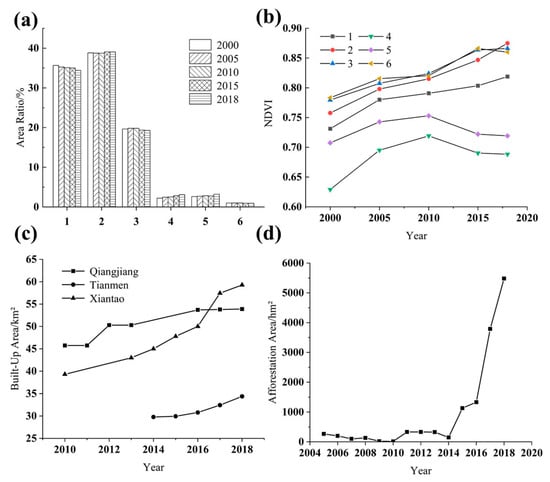 The effects of human activities on NDVI: (a) the trend of the land use change, (b) the trend of NDVI change corresponding to different land-use types, (c) the built-up area in the downstream, (d) the afforestation area in the Shennongjia Region.