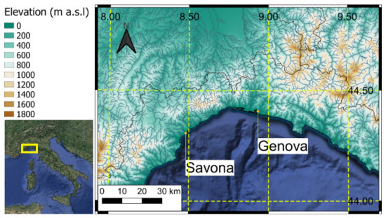 The study area, corresponding to the territory of the Italian region called Liguria, is located along the north-western coast of Italy (see Figure 1). From a morphological point of view, the region is characterized by high mountain ranges, with a maximum height between 1000 and 2000 m a.s.l. (above sea level) that run parallel to the coast and reach their maximum height a few kilometers from the coast. The particular morphology leads to the formation of meteorological patterns specific to the region, capable of producing rainfall of relatively short duration and extremely high intensity (up to an average of 200 mm in one hour and 500–600 mm in 12 h) (see e.g., [37]). The particular meteorological situation, combined with the morphology, characterized by small basins with a high average slope, makes the region particularly exposed to flash flood risk. This type of morphology is very similar to that of several areas of the Mediterranean (e.g., Spanish, Greek, Algerian, French, and Turkish coasts) as well as the hydro-meteorological events that cause economic damage and deaths [38,39,40]. The region provides an excellent study area representative of the entire Mediterranean belt subject to flash floods.