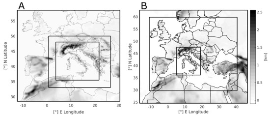 Figure 3. (A) Truth run (TR) setup: three two-way nested domains with 13.5, 4.5, and 1.5 km grid spacing. (B) Forecast runs (FC) setup: three two-way nested domains with 22.5, 7.5, and 2.5 km. Grey shading indicates the model terrain. - the TR is initialized at 00UTC of the 14th of October 2019 with the ECMWF-IFS (European Centre for Medium-Range Weather Forecasts Integrated Forecasting System) global model at 0.125° grid spacing and forced at the boundaries at an hourly frequency with the same product. The FC simulations are initialized at 00UTC of the 14th of October 2019 with the NCEP-GFS (National Centers for Environmental Prediction Global Forecast System) analysis and forecast data available at a horizontal grid spacing of 0.25° × 0.25° and forced at the boundaries every three hours;