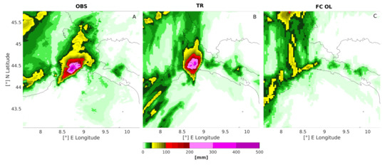 Twelve-hour accumulated rainfall between 21 UTC of the 14th of October and 09 UTC of the 15th from the merged radar and rain-gauges observation OBS (Panel A), the TR (Panel B), and from the FC_OL (Panel C).