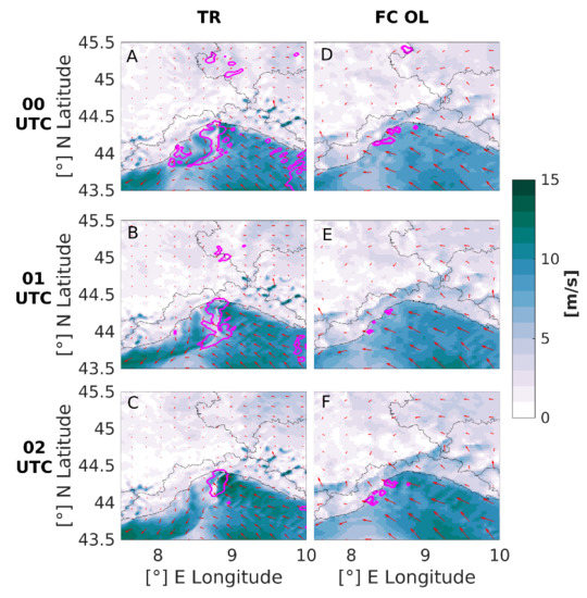 Conversely, the FC_OL is not able to capture the correct dynamics of this event: Figure 5D–F shows that the convergence line is completely absent in the FC_OL simulation between 00 and 02 UTC. Consequently, the peak accumulated rainfall in 12 h is less than 100 mm and the precipitation is more spatially distributed (Figure 4C). The dynamics of the TR and the FC_OL seem to significantly diverge in the afternoon of the 14th of October. In fact, in the morning of the 14th both configurations model a convergence line over the sea. Later during the day, in the FC_OL, this line moves towards France and gets weaker, while in the TR, the convergence line intensifies (not shown). This is likely due to either a wrong description of the thermodynamical state of the continental air mass in the FC_OL, which prevents it from overcoming the orographic barrier and flow over the sea, or a too strong south-easterly flow from the sea, or a combination of both.
