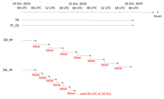The assimilation experiments are performed sampling the observation at different spatial (2.5 km, 5 km, GNSS network location) and temporal (3 h, 6 h) resolutions in all the possible combinations. Table 1 introduces the experiments and Figure 6 shows a schematic of the OSSEs data assimilation timing. Note that in the first 6 hours, the OSSEs have no assimilation that is due to the TR spin-up. The lower spatial resolution is set to 2.5 km (the FC resolution) because higher resolution violates the assumption of spatially independent observation errors for the matrix [19,21,22].