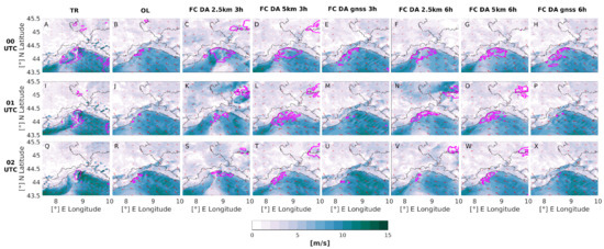 10 m wind field (colors and arrows) and ZTD 252 mm isoline (magenta line) comparison during the main phase of the event: 00 UTC (first row), 01 UTC (second row), 02 UTC (third row) between TR (Panels A, I, Q), OL (Panels B, J, R), FC_DA_2.5 km_3 h (Panels C, K, S), FC_DA_5 km_3 h (Panels D, L, T), FC_DA_gnss_3 h (Panels E, M, U), FC_DA_2.5 km_6 h (Panels F, N, V), FC_DA_5 km_6 h (Panels G, O, W), FC_DA_gnss_6 h (Panels H, P, X).