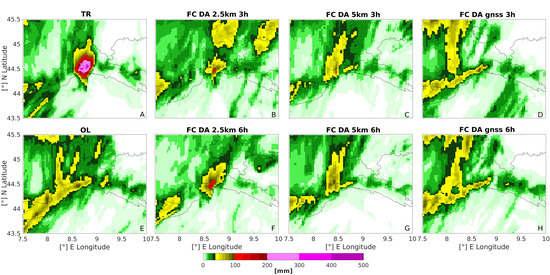 Thus, the effects of the ZTD assimilation on the surface wind dynamics have direct impacts on the forecast of the rainfall pattern (Figure 8). In particular, the presence of the well-defined surface convergence line when assimilating the ZTD at 2.5 km grid spacing, in experiments FC_DA_2.5 km_3 h and FC_DA_2.5 km_6 h, results in a more localized rainfall pattern (Panels B and F, respectively). Although being weaker, this is very consistent with the TR rainfall field, which shows the typical V-shape pattern of the Ligurian MCSs [4]. Assimilating a coarser ZTD product, namely the Hydroterra-like ZTD at 5 km, in the FC_DA_5 km_3 h (Panel C) and FC_DA_5 km_6 h (Panel G) runs, results in a rainfall pattern that is more localized than the OL one, but less than in the above mentioned 2.5 km experiments. With respect to the FC_DA_2.5 km experiments, the rainfall peak appears to be shifted westward. Concerning the simulation of the surface convergence field, the assimilation of ZTD at the GNSS locations, in the experiments FC_DA_gnss_3 h (Panel D) and FC_DA_gnss_6 h (Panel H), instead, maintains a more widespread rainfall pattern very similar to the FC_OL one. Note that the time intervals of the rainfall accumulation are different. In the TR, the 12 h accumulation interval is between 21 UTC of the 14th and 09 UTC of 15th of October. In the FC experiments, instead, it is between 00 and 12 UTC of the 15th of October. The reason for this is because in the FC runs, despite the assimilation procedure, a temporal shift of roughly three hours of the intense rainfall remained.