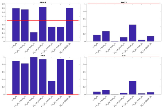 Summarizing, it is possible to say that assimilating the ZTD Hydroterra-like observations produces the best improvement in a very challenging forecast, where the dynamical and thermodynamical differences between FC_OL and TR are large. In particular, the higher spatial resolution (2.5 km) seems to be the most effective in changing the wind dynamics and, consequently, the rainfall pattern. Both temporal resolutions of the assimilation (3 and 6 h) produce this improvement. However, the simulation assimilating every 3 h (FC_DA_2.5 km_3 h) still maintains a high FAR, due to the shifting of the simulated convergence line. Instead, a more persistent convergence line in the simulation with data assimilation performed every 6 h (FC_DA_2.5 km_6 h) gives a lower FAR (Figure 9).