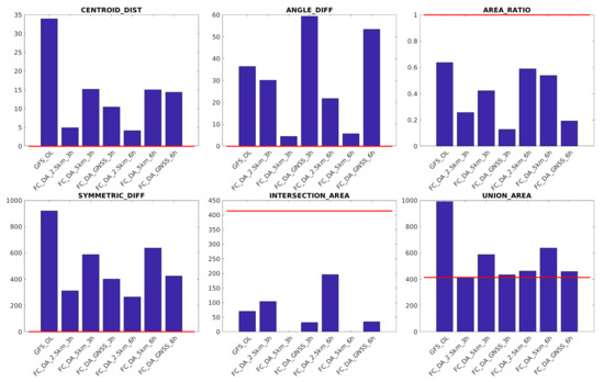 In this work, to evaluate the ZTD assimilation performances, 10 different indices are considered above 48 mm threshold. They include both pairs of object attributes and classical statistical scores, namely, for the geometrical indices we consider: centroid distance (CENTROID_DIST), angle difference (ANGLE_DIFF), area ratio (AREA_RATIO), symmetric difference (SYMMETRIC_DIFF), intersection area (INTERSECTION_AREA), and union area (UNION_AREA), while for the classical statistical indices we consider: Frequency BIAS (FBIAS), Probability of Detection Yes (PODY), False Alarm Ratio (FAR), and Critical Success Index (CSI). For a complete description of the indices refer to References [22,63,74].