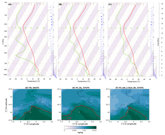 A representative point within the moist and conditionally unstable air mass in the Ligurian sea is chosen to produce the Skew-T diagram and to calculate the relevant indices of the Poletti et al. [87] checklist. The virtual vertical soundings are shown in Panels A–C of Figure 11, while the corresponding surface water vapor mixing ratio maps are shown in Panels D–F. The soundings are taken in the early phase of the event, which are a few hours apart depending on the configuration, as discussed above. In particular, the virtual sounding is taken at 4 UTC in the TR experiment and at 7 UTC of the 15th of October in the FC_OL and FC_DA_2.5 km_6 h experiments.