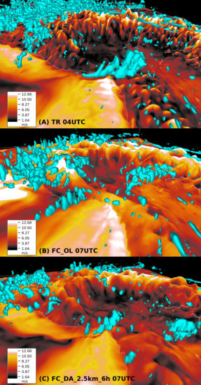Rendering of the surface wind speed (colors) and vertical updrafts (cyano isosurfaces at 1 m/s) for TR at 4 UTC (A), FC_OL (B) and FC_DA_2.5 km_6 h (C) at 7 UTC on the 15th of October 2018.