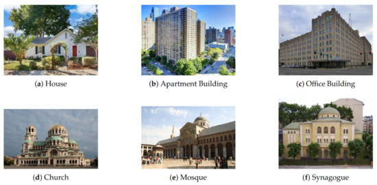 As for functional analysis, even for a human observer, the classification of urban buildings from photographs of their facades is not straightforward. As can be observed from the sample photographs in Figure 1, buildings fulfilling different functions can be confused with one another: e.g., an apartment building can be confused with an office building and vice versa due to their similar shapes, materials, and myriad of windows (see Figure 1b,c). Additionally, buildings fulfilling a similar general function are often difficult to differentiate: e.g., buildings with religious and spiritual purposes can showcase similar design features (cupolas, towers, elaborately decorated facades, etc.) making them hard to distinguish (see church, mosque, and synagogue in Figure 1d–f) from an image where revealing signs (Christian cross, Star of David etc.) are concealed.