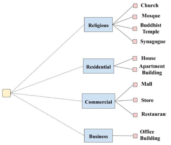 For the classification of urban buildings based on functionality, a new extensive dataset of 6297 images was built. The images are divided across 10 classes: Mosque, Church, Synagogue, Buddhist Temple, House, Apartment Building, Office Building, Mall, Store (includes retail stores such as grocery supermarkets, department stores, and clothing brands stores), and Restaurant (also includes cafes). Following the coarse-to-fine paradigm, we define a class tree, shown in Figure 2, based on a simple semantic taxonomy where:
