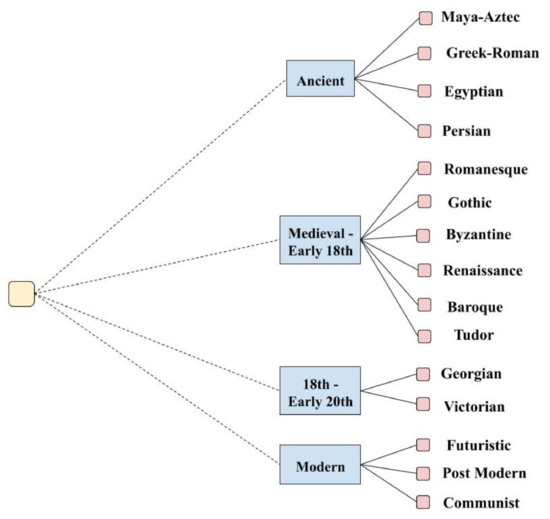 For architectural style classification, we built a smaller dataset to perform additional experiments with the proposed method. The dataset has a total of 1,033 images spread out across 15 different style classes, namely: Maya-Aztec, Greek-Roman, Egyptian, Persian, Romanesque, Gothic, Byzantine, Renaissance, Baroque, Tudor, Georgian, Victorian, Futuristic, Post Modern, and Communist. We established the class tree by dividing these fine classes across historical time periods as shown in Figure 3.