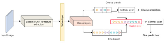 In the B-CNN model, the information gained from the coarse prediction is implicit. It benefits from the fact that lower-level layers of CNNs learn generic patterns, and as they get deeper, higher-level features are learned by branching out at different points of the baseline neural network. Therefore, the deeper levels of the network can focus on solely solving the fine classification task.