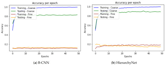 In order to illustrate the effect of the HN’s custom layer, suppose we set the loss weights to and in Equation (3), making the models ignore the fine branch classification, and only focus on learning the coarse classification. Both the B-CNN and HN models have a similar behavior in this case as can be seen from Figure 5a,b respectively.