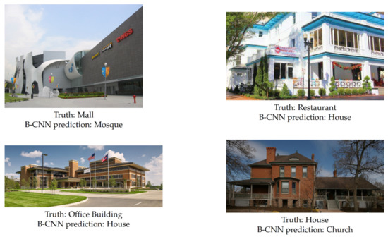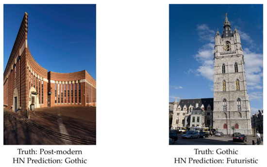 Figure 7 provides examples of building images that the HierarchyNet could correctly classify across both hierarchical levels whereas the B-CNN failed at both. In total, there are 30 such cases out of the 1260 images in the set.