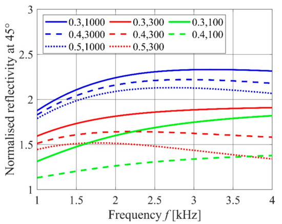 In order to select an appropriate sound frequency range for the purpose of this study, reflectivity from a virtual soil surface was estimated by a model for the acoustic impedance of a ground surface [14] for sound frequency ranging from 1 to 4 kHz. In doing so, the following model parameter values were selected: soil porosity = 0.3, tortuosity = 1.35, flow resistivity = 100 to 103 kPa s m−2, and pore shape factor ratio = 0.75. Simulation results are shown in Figure 1 for the frequency range 1 to 4 kHz and for an angle of incidence of 45°. The reflectivity has been normalized to that from soil of porosity 0.5 and flow resistivity 100 kPa s m−2.